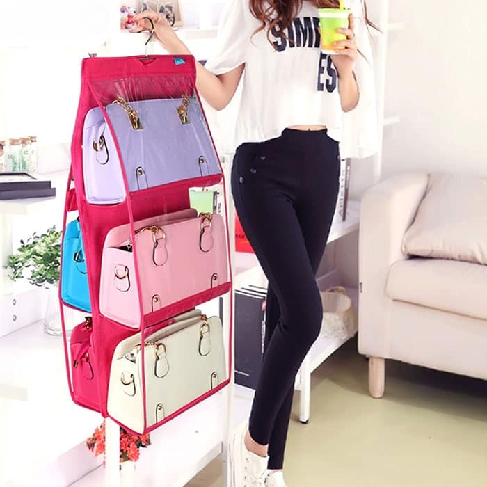 ارگانایزر کیف 6 خانه داخل کمد ، محصولی نوین و بسیار کاربردی است . این نگهدارنده به صورت دوطرفه همراه با قلاب آویز جهت آویزان کردن داخل کمد و یا پشت درب می باشد . آویز کاور و نگهدارنده کیف امکان استفاده از حداقل فضای ممکن برای نگهداری کیف های شما را فراهم می کند . فضای محفظه های نگهدارنده به گونه ای طراحی شده که علاوه بر کیف از آن می توان جهت نگهداری کفش نیز استفاده نمود . از دیگر ویژگی های این آویز ، جلوگیری از کثیف شدن ، له شدن و خراب شدن کیف و کفش است .